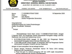 Sanksi tersebut tercantum dalam Surat Nomor: 1533/MB.07/DJB.T/2025 tertanggal 18 September 2025 yang ditandatangani Direktur Jenderal Mineral dan Batubara, Tri Winarno.